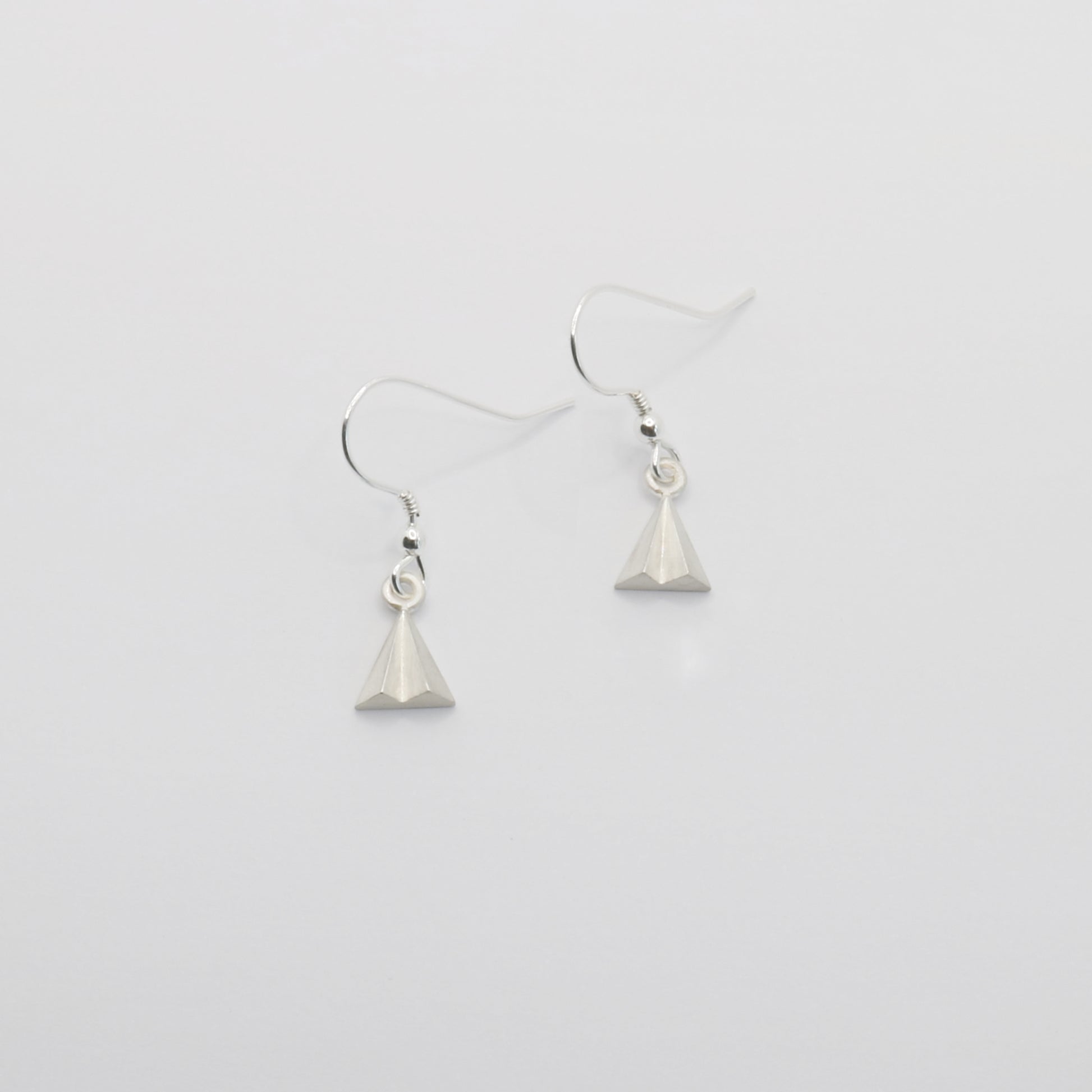 These Small Triangle Peak pair of drop earrings are made from Sterling Silver. They sit just below the ear lobe and are featured on a sterling silver drop hook finding.