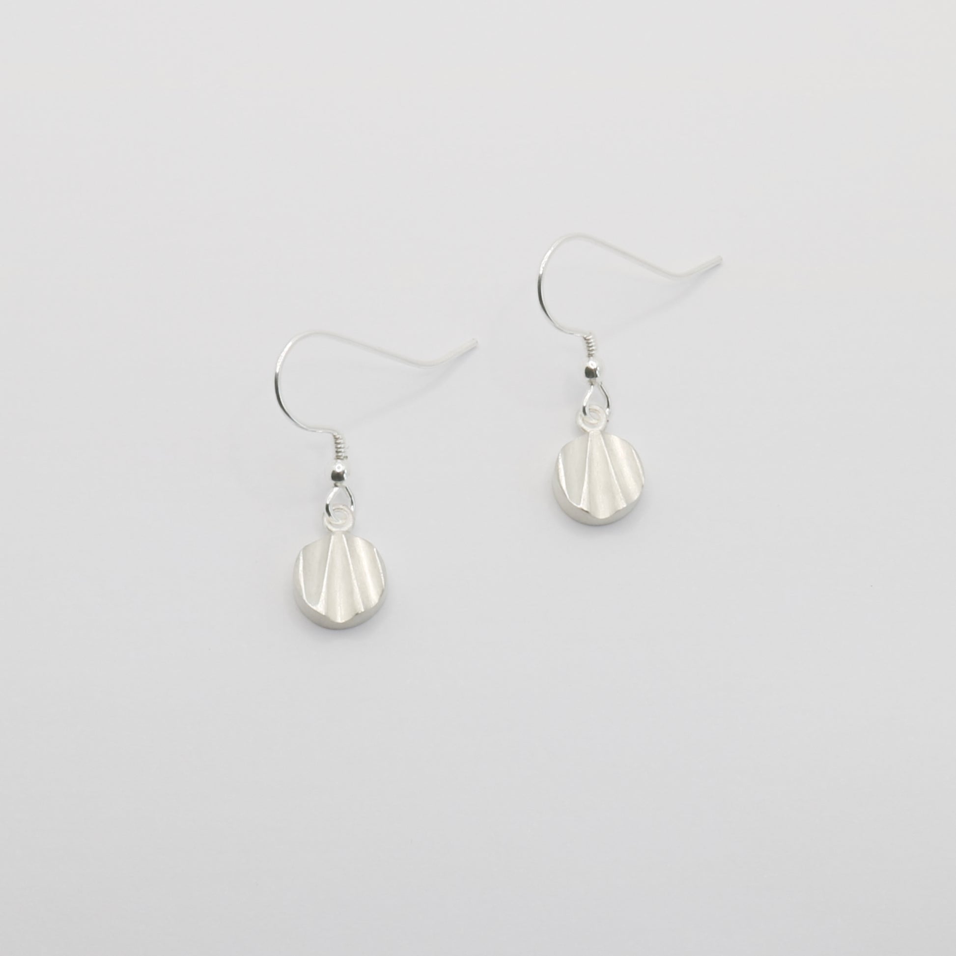These Small Circle Wave pair of drop earrings are made from Sterling Silver. They sit just below the ear lobe and are featured on a sterling silver drop hook finding.